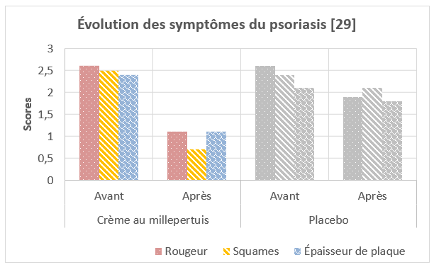 Lors d’une étude clinique réalisée sur quatre semaines, une crème contenant un extrait de millepertuis a montré son efficacité sur l’évolution de plaques de psoriasis (application deux fois par jour), avec une diminution d’environ 60 % sur les facteurs d’érythème, de développement et d’épaisseur [30].